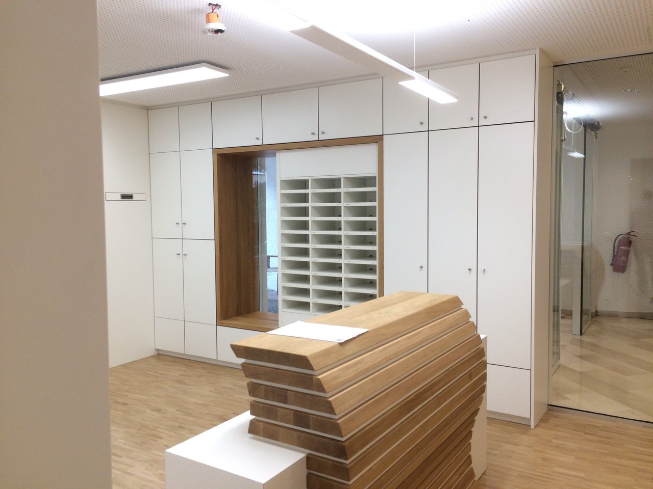 In den Büro- und Empfangsräumen wurde, die eigens entworfene und nach Maß gefertigte Möblierung so gestalten, dass es sowohl den Anforderungen der Nutzer/-innen als auch einem modernen, funktionalen und atmosphärischen Bild entspricht.