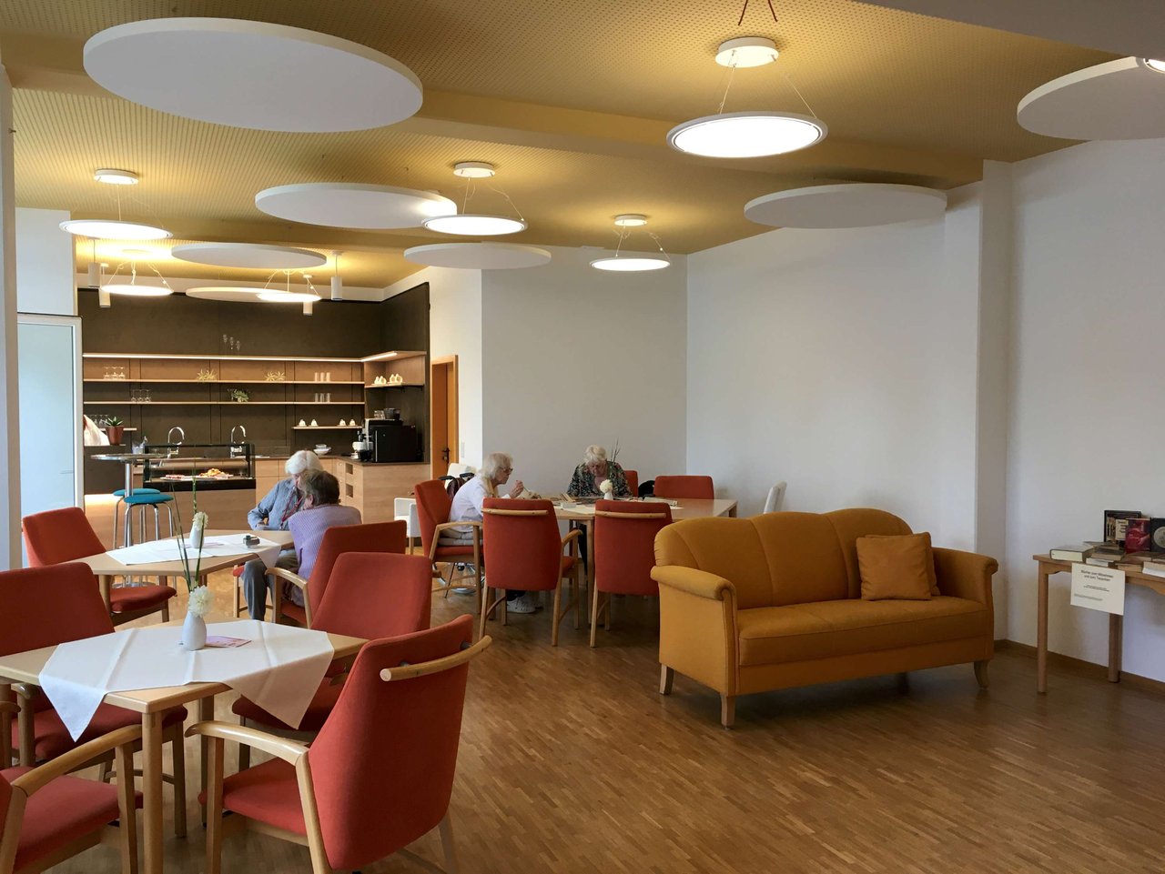 Im Eingangsbereich sorgt eine helle, freundliche Beleuchtung dafür, dass sich jeder sofort willkommen fühlt. Die Cafeteria erstrahlt nun in einem warmen Licht, das eine gemütliche und einladende Umgebung schafft, in der die Bewohner/-innen ihre Mahlzeiten genießen können.