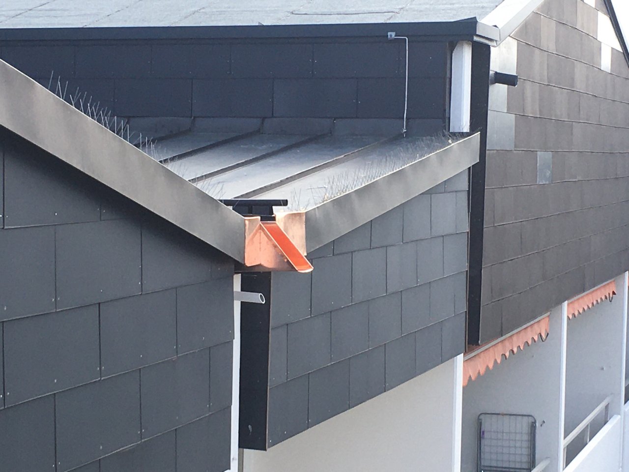 Die kupfergedeckten Dächer wurden überarbeitet und Notüberläufe nachgerüstet. Die Fassaden aus Putzflächen und Betonfertigteilbalkonen wurden instandgesetzt.
