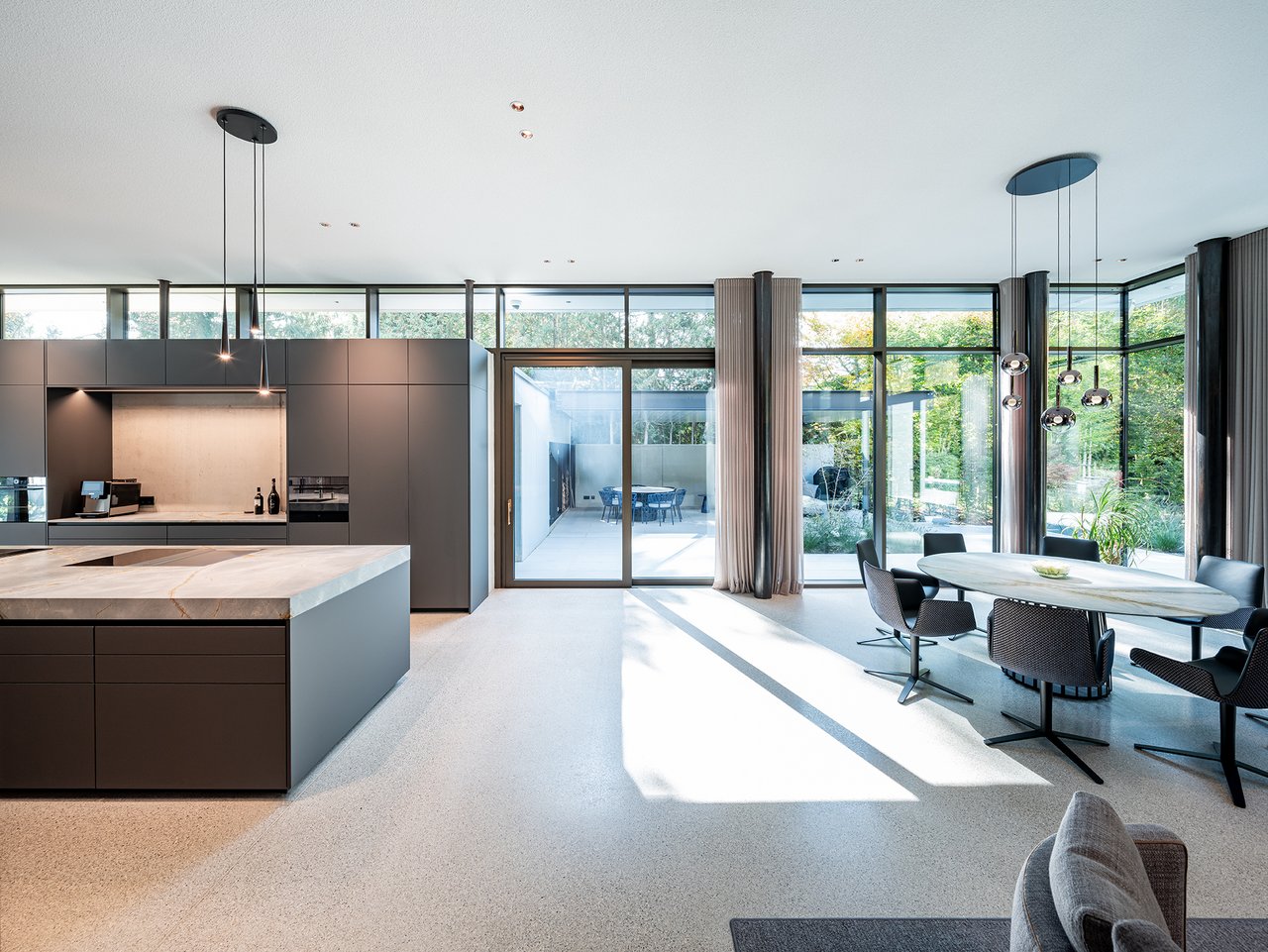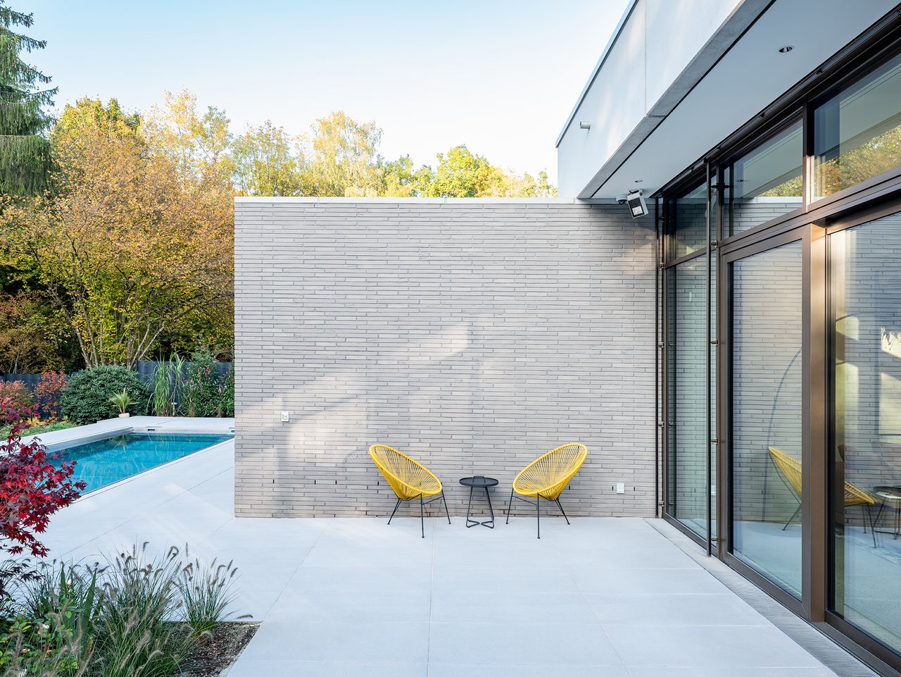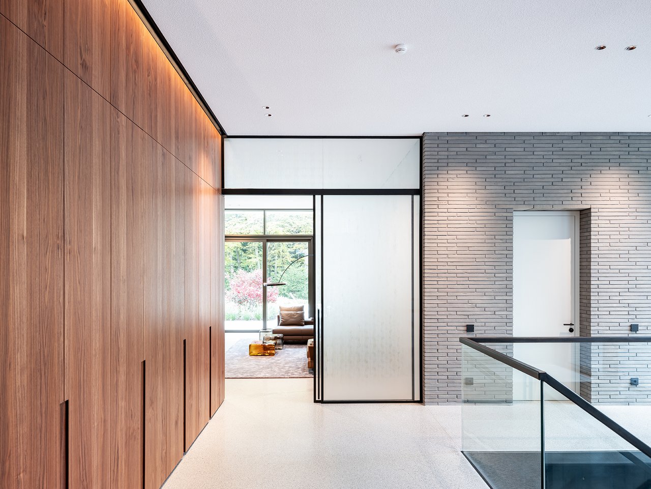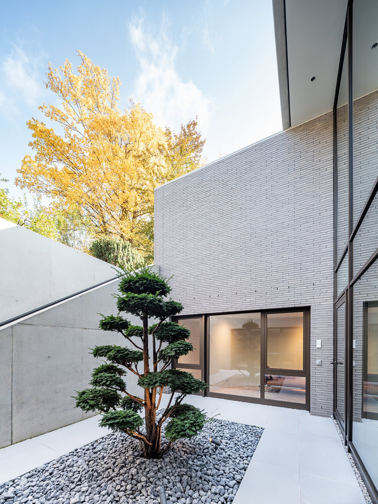 Auf einem großzügigen Grundstück entstand ein modernes Einfamilienhaus in gehobenem Standard, das sich sensibel in den vorhandenen Baumbestand einfügt. Der Neubau wurde im vorderen Bereich des Grundstücks positioniert und bildet dadurch eine klare räumliche Trennung zwischen dem öffentlichen Straßenraum und dem privaten Garten im rückwärtigen Grundstücksteil. Der Baukörper gliedert sich in einen hohen, zentralen Hauptkörper mit umlaufend weit auskragendem Flachdach sowie drei niedrigere, angedockte beziehungsweise eingeschobene Boxen, die ebenfalls mit Flachdächern ausgebildet sind. Insgesamt entsteht dadurch ein flächiger, bungalowartiger Charakter. Dieses Konzept spiegelt sich auch in der materiellen Ausgestaltung der Baukörper wider: Während der Hauptkörper transparent gestaltet ist, treten die seitlichen Boxen als massive, kubische Volumen mit präzise gesetzten Lochfenstern in Erscheinung. Großzügige Verglasungen öffnen den zentralen Wohnbereich zum Garten und schaffen fließende Übergänge zwischen Innen- und Außenraum. So entsteht eine klare architektonische Struktur mit offenen, großzügigen Raumbeziehungen und einer hohen Wohnqualität. Im Inneren wurde großer Wert auf Innenarchitektur, Materialität und gestalterische Details gelegt. Hochwertige Einbauten, maßgefertigte Holzoberflächen sowie sorgfältig abgestimmte Materialien und Lichtkonzepte prägen die Räume und verleihen dem Haus eine ruhige, elegante Atmosphäre.