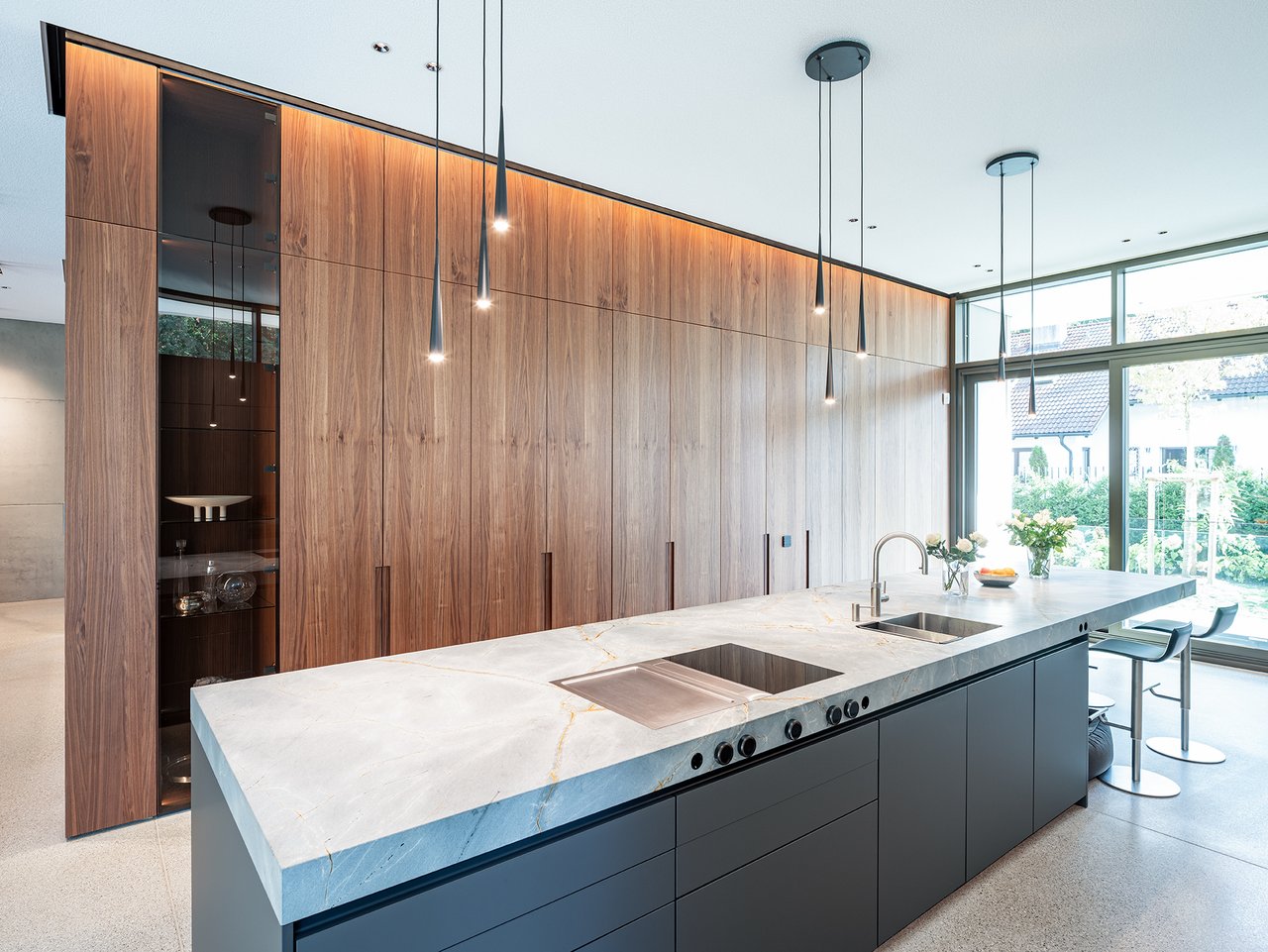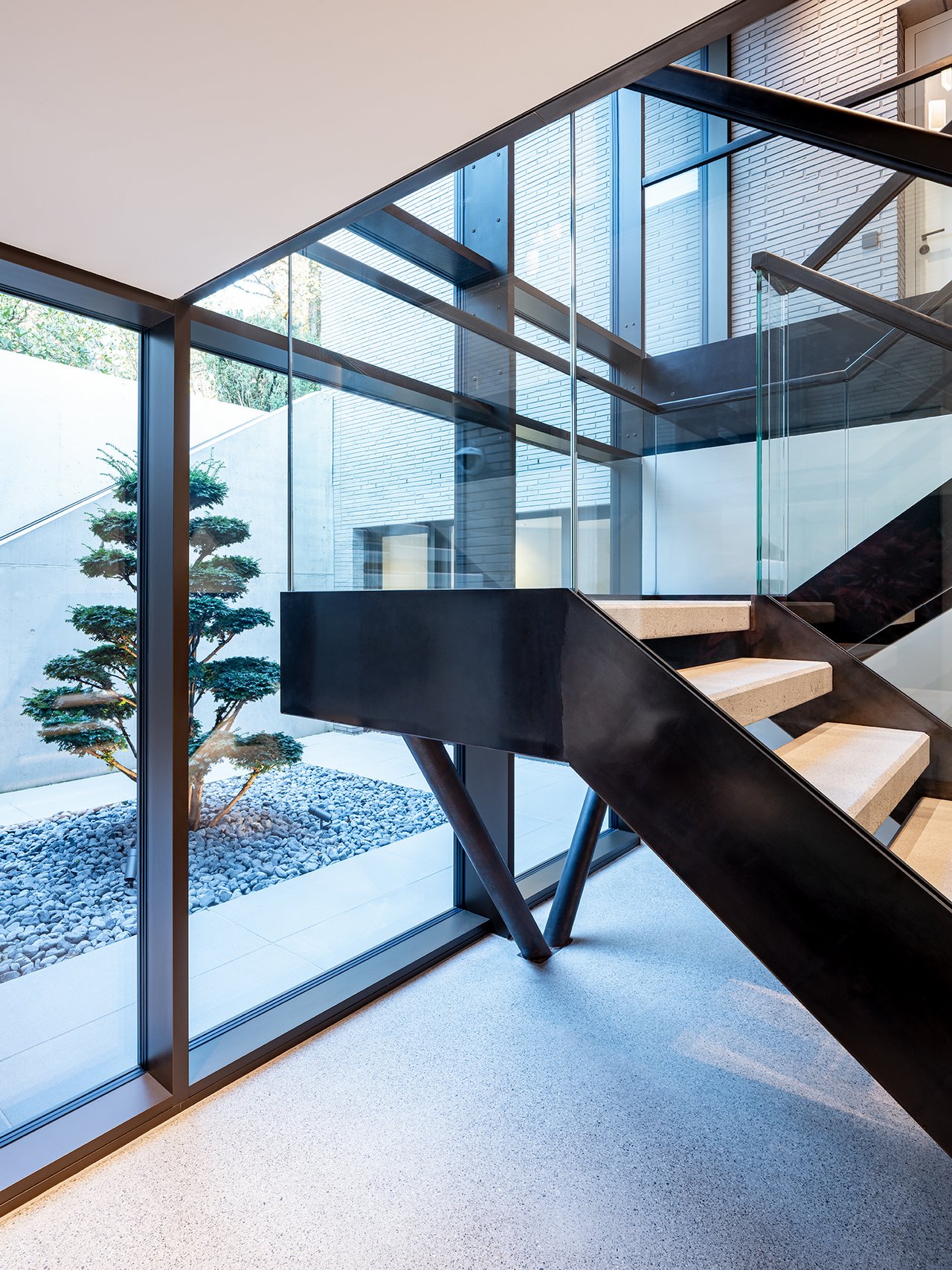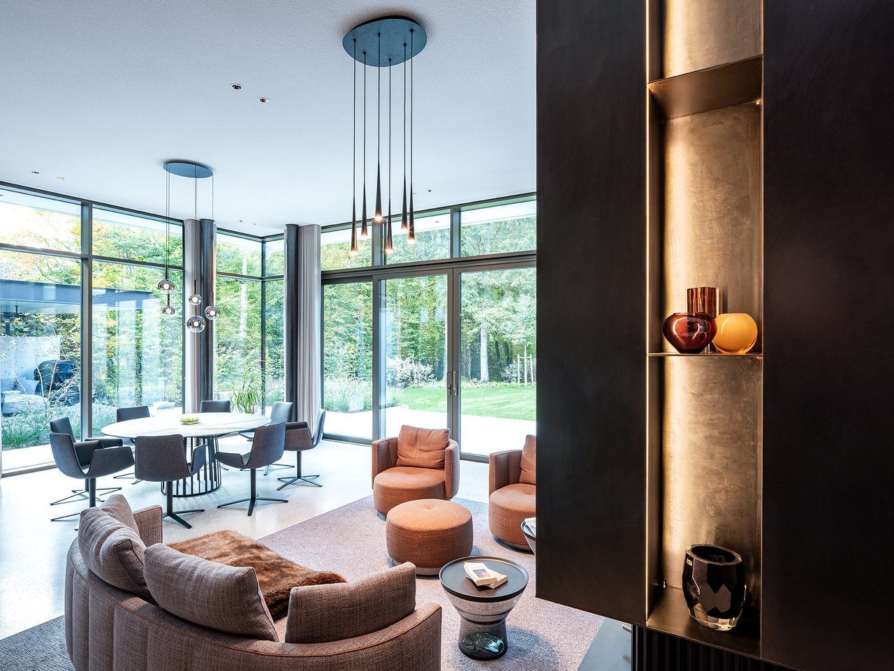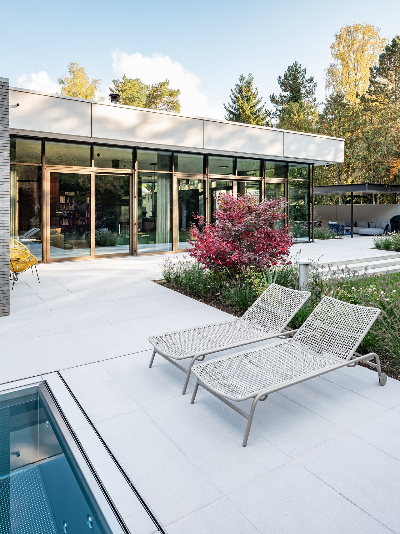 Auf einem großzügigen Grundstück entstand ein modernes Einfamilienhaus in gehobenem Standard, das sich sensibel in den vorhandenen Baumbestand einfügt. Der Neubau wurde im vorderen Bereich des Grundstücks positioniert und bildet dadurch eine klare räumliche Trennung zwischen dem öffentlichen Straßenraum und dem privaten Garten im rückwärtigen Grundstücksteil. Der Baukörper gliedert sich in einen hohen, zentralen Hauptkörper mit umlaufend weit auskragendem Flachdach sowie drei niedrigere, angedockte beziehungsweise eingeschobene Boxen, die ebenfalls mit Flachdächern ausgebildet sind. Insgesamt entsteht dadurch ein flächiger, bungalowartiger Charakter. Dieses Konzept spiegelt sich auch in der materiellen Ausgestaltung der Baukörper wider: Während der Hauptkörper transparent gestaltet ist, treten die seitlichen Boxen als massive, kubische Volumen mit präzise gesetzten Lochfenstern in Erscheinung. Großzügige Verglasungen öffnen den zentralen Wohnbereich zum Garten und schaffen fließende Übergänge zwischen Innen- und Außenraum. So entsteht eine klare architektonische Struktur mit offenen, großzügigen Raumbeziehungen und einer hohen Wohnqualität. Im Inneren wurde großer Wert auf Innenarchitektur, Materialität und gestalterische Details gelegt. Hochwertige Einbauten, maßgefertigte Holzoberflächen sowie sorgfältig abgestimmte Materialien und Lichtkonzepte prägen die Räume und verleihen dem Haus eine ruhige, elegante Atmosphäre.