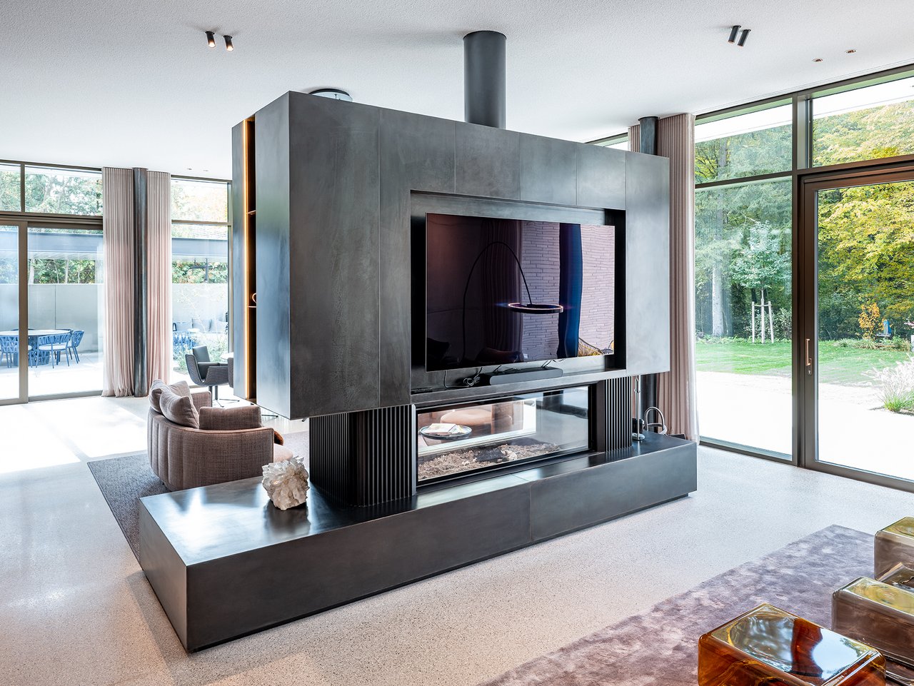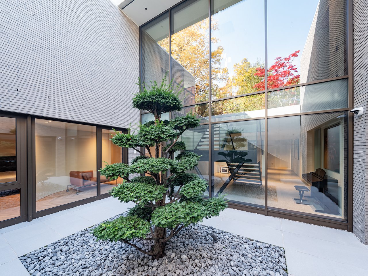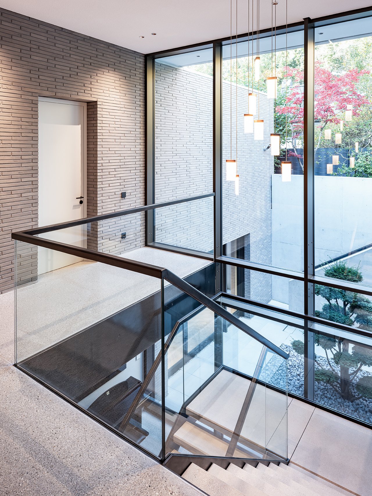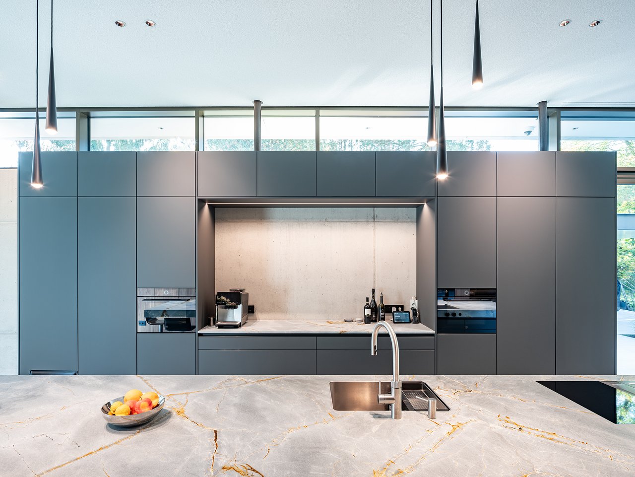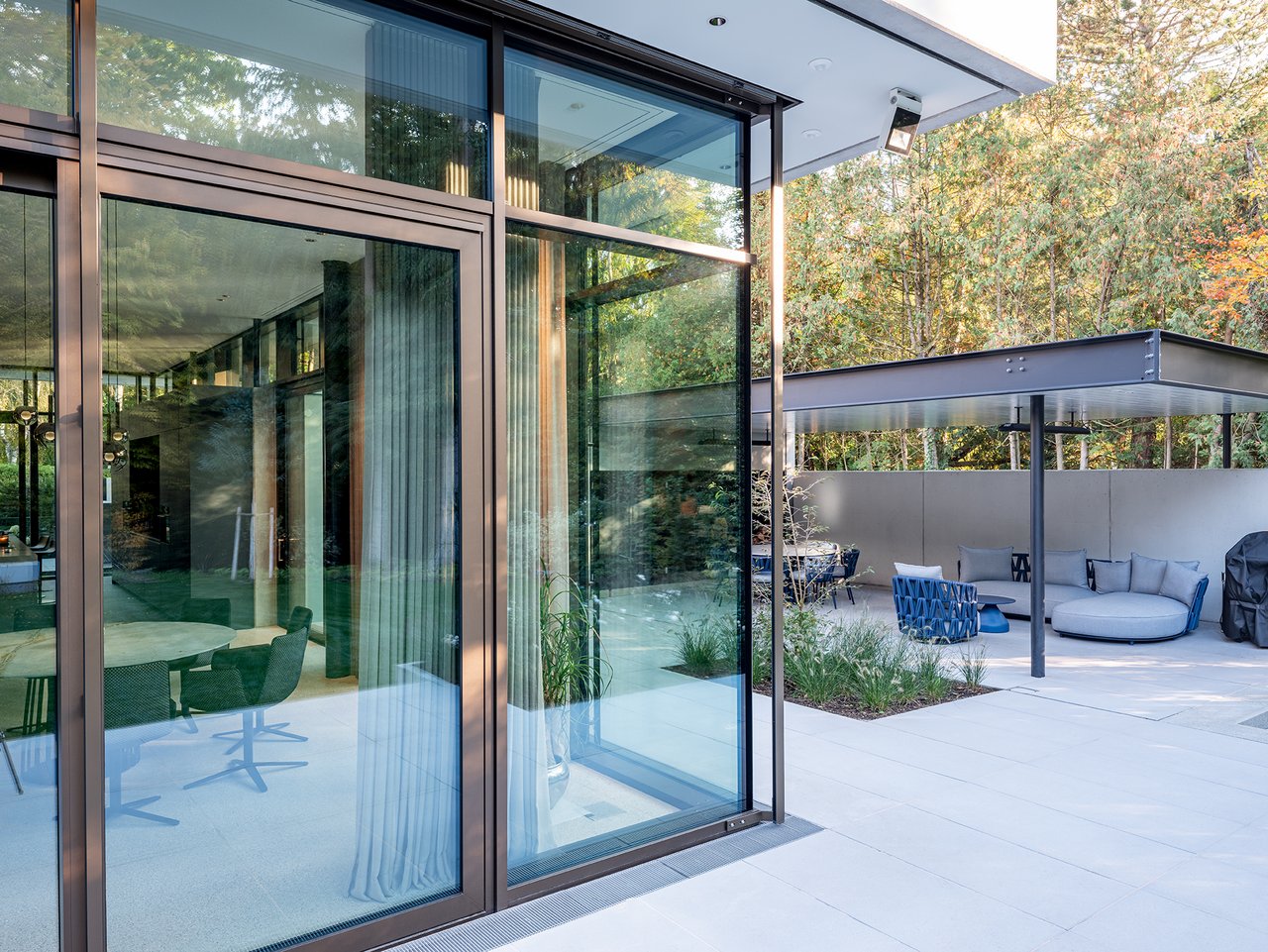 Auf einem großzügigen Grundstück entstand ein modernes Einfamilienhaus in gehobenem Standard, das sich sensibel in den vorhandenen Baumbestand einfügt. Der Neubau wurde im vorderen Bereich des Grundstücks positioniert und bildet dadurch eine klare räumliche Trennung zwischen dem öffentlichen Straßenraum und dem privaten Garten im rückwärtigen Grundstücksteil. Der Baukörper gliedert sich in einen hohen, zentralen Hauptkörper mit umlaufend weit auskragendem Flachdach sowie drei niedrigere, angedockte beziehungsweise eingeschobene Boxen, die ebenfalls mit Flachdächern ausgebildet sind. Insgesamt entsteht dadurch ein flächiger, bungalowartiger Charakter. Dieses Konzept spiegelt sich auch in der materiellen Ausgestaltung der Baukörper wider: Während der Hauptkörper transparent gestaltet ist, treten die seitlichen Boxen als massive, kubische Volumen mit präzise gesetzten Lochfenstern in Erscheinung. Großzügige Verglasungen öffnen den zentralen Wohnbereich zum Garten und schaffen fließende Übergänge zwischen Innen- und Außenraum. So entsteht eine klare architektonische Struktur mit offenen, großzügigen Raumbeziehungen und einer hohen Wohnqualität. Im Inneren wurde großer Wert auf Innenarchitektur, Materialität und gestalterische Details gelegt. Hochwertige Einbauten, maßgefertigte Holzoberflächen sowie sorgfältig abgestimmte Materialien und Lichtkonzepte prägen die Räume und verleihen dem Haus eine ruhige, elegante Atmosphäre.