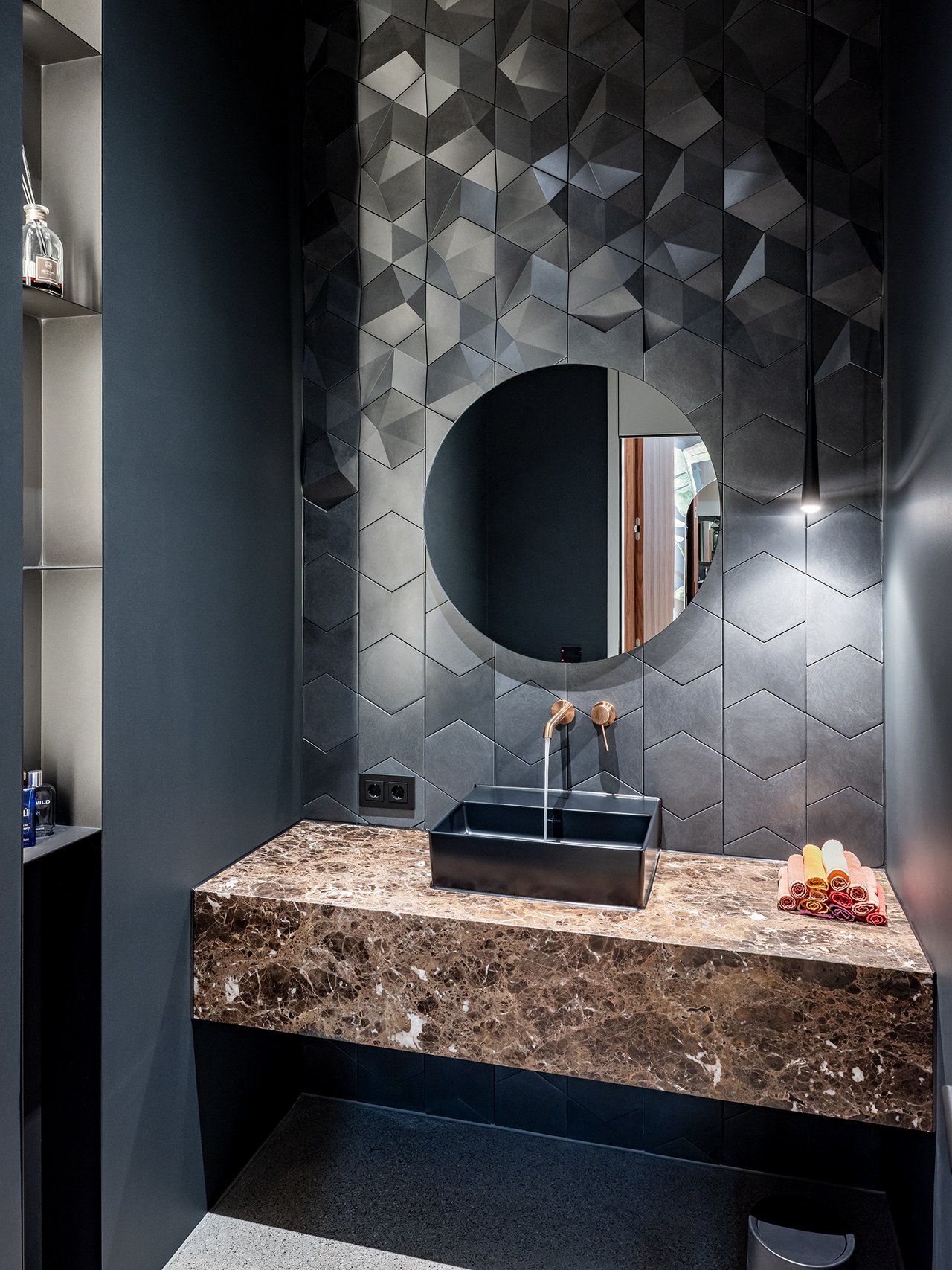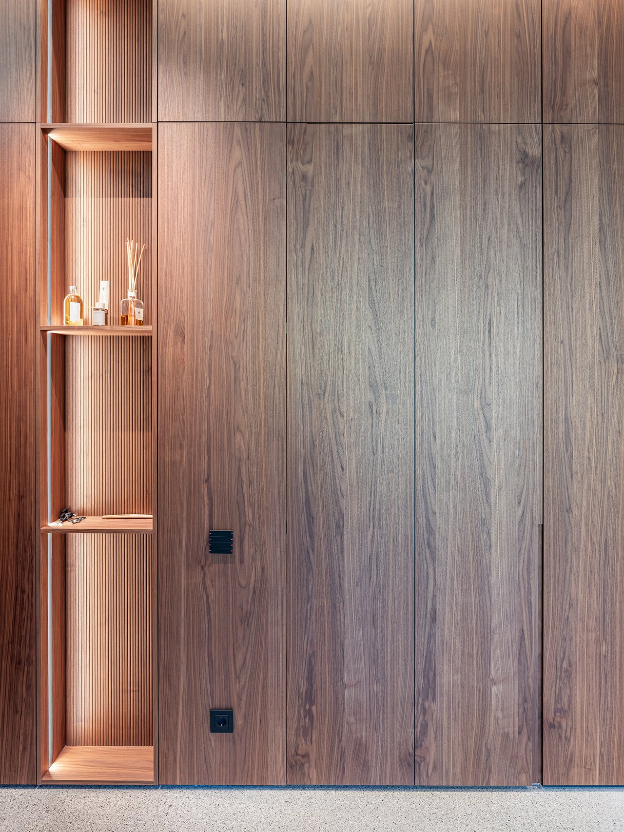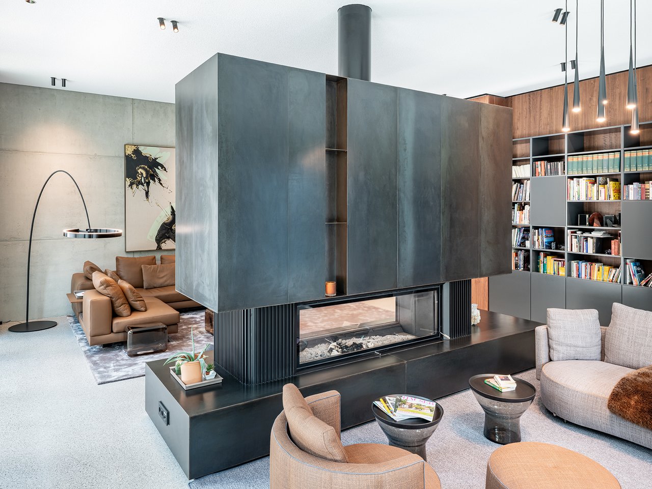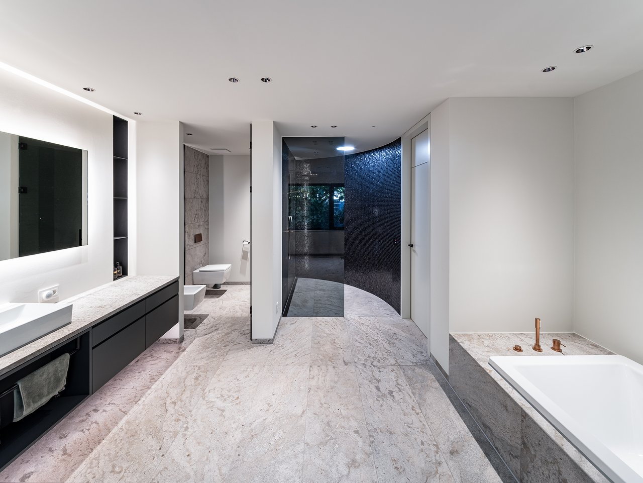 Auf einem großzügigen Grundstück entstand ein modernes Einfamilienhaus in gehobenem Standard, das sich sensibel in den vorhandenen Baumbestand einfügt. Der Neubau wurde im vorderen Bereich des Grundstücks positioniert und bildet dadurch eine klare räumliche Trennung zwischen dem öffentlichen Straßenraum und dem privaten Garten im rückwärtigen Grundstücksteil. Der Baukörper gliedert sich in einen hohen, zentralen Hauptkörper mit umlaufend weit auskragendem Flachdach sowie drei niedrigere, angedockte beziehungsweise eingeschobene Boxen, die ebenfalls mit Flachdächern ausgebildet sind. Insgesamt entsteht dadurch ein flächiger, bungalowartiger Charakter. Dieses Konzept spiegelt sich auch in der materiellen Ausgestaltung der Baukörper wider: Während der Hauptkörper transparent gestaltet ist, treten die seitlichen Boxen als massive, kubische Volumen mit präzise gesetzten Lochfenstern in Erscheinung. Großzügige Verglasungen öffnen den zentralen Wohnbereich zum Garten und schaffen fließende Übergänge zwischen Innen- und Außenraum. So entsteht eine klare architektonische Struktur mit offenen, großzügigen Raumbeziehungen und einer hohen Wohnqualität. Im Inneren wurde großer Wert auf Innenarchitektur, Materialität und gestalterische Details gelegt. Hochwertige Einbauten, maßgefertigte Holzoberflächen sowie sorgfältig abgestimmte Materialien und Lichtkonzepte prägen die Räume und verleihen dem Haus eine ruhige, elegante Atmosphäre.
