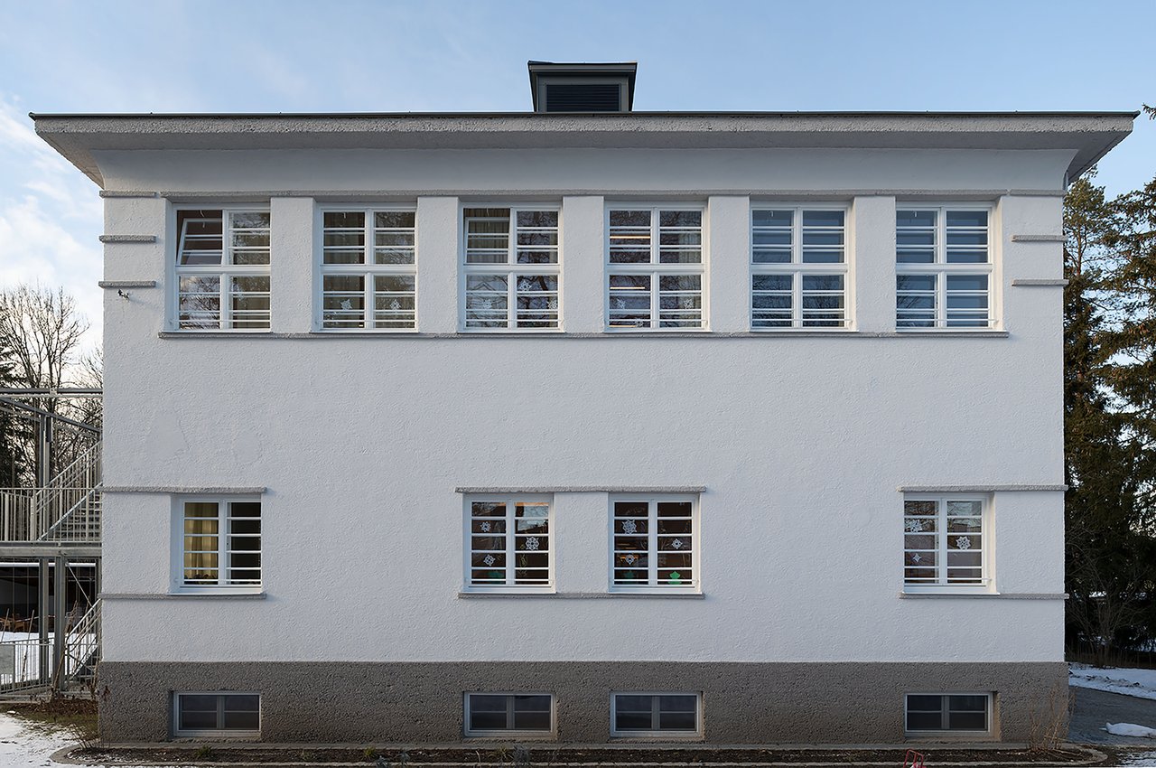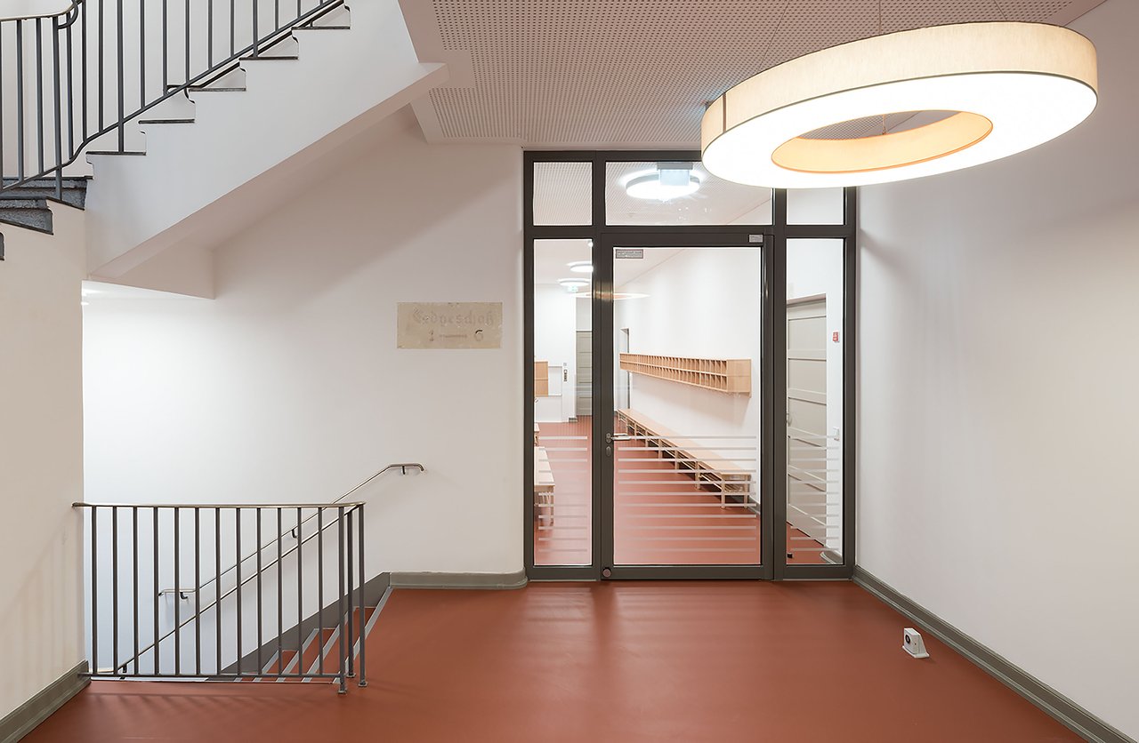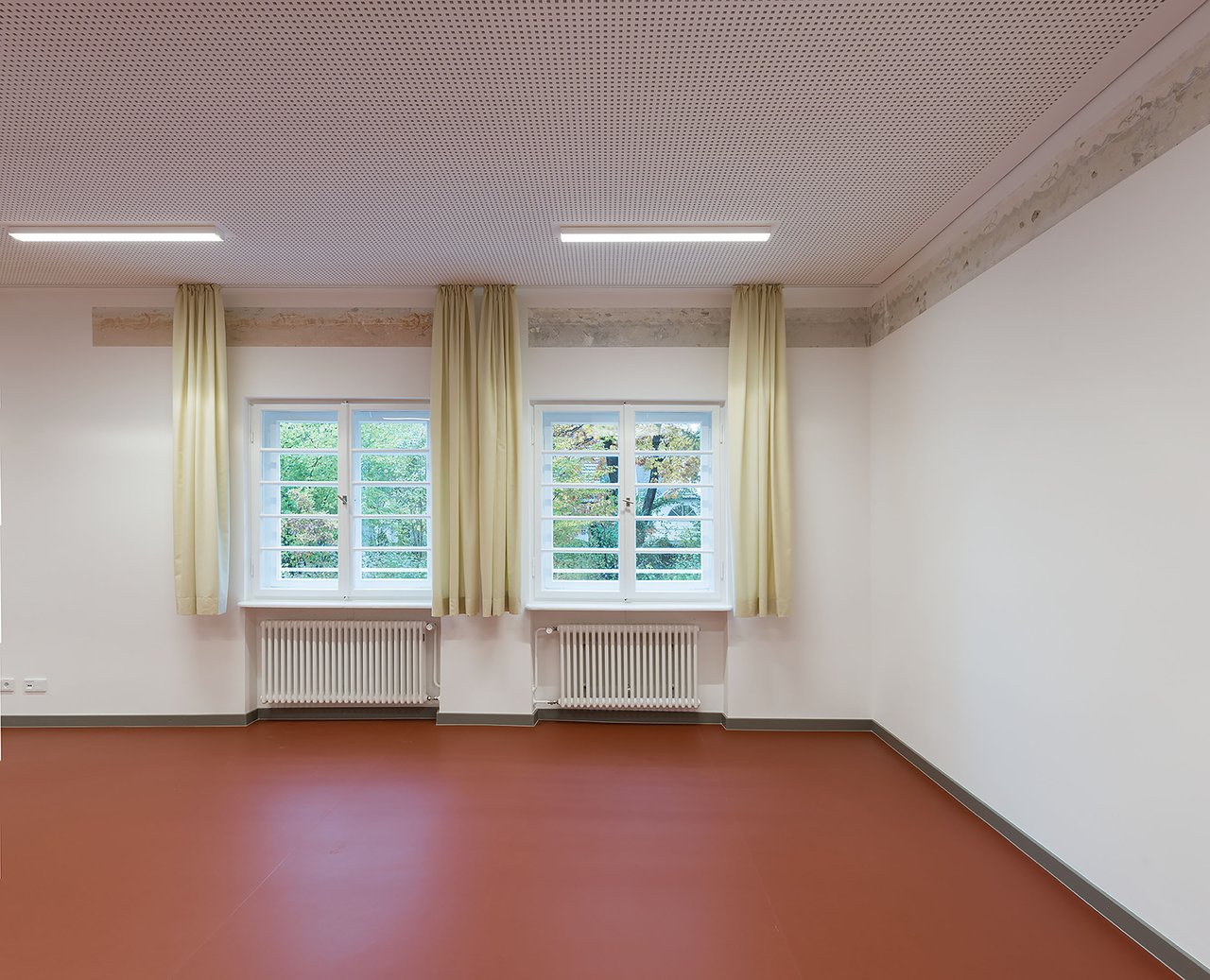 Das ehemalige Schulgebäude aus den 1920er Jahren steht unter Denkmalschutz. Neben der Instandsetzung der Außenhaut wurden im Inneren räumliche Umnutzungen (Verlegung der Küche) und umfangreiche Sanierungs-, Brandschutz- und Akustikmaßnahmen sowie eine Erneuerung der Haustechnik- und Elektroanlagen durchgeführt. Vor Ausführungsbeginn wurde eine umfangreiche Bestandsaufnahme des historischen Gebäudes vorgenommen, die Grundlage für das Sanierungskonzept des gesamten Gebäudes bildete. Die originalen Kastenfenster und Türen aus Holz einschließlich ihrer Beschläge wurden überarbeitet und konnten erhalten bleiben. In Absprache mit der Denkmalschutzbehörde wurde die originale Farbgebung rekonstruiert und ein Farbkonzept entwickelt.