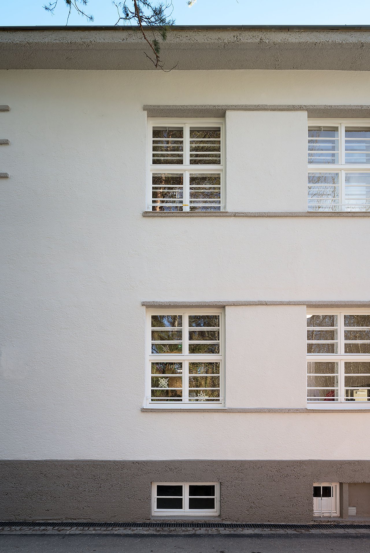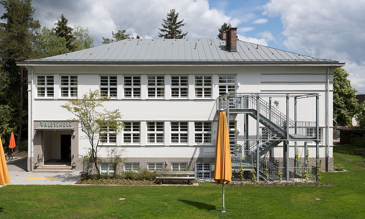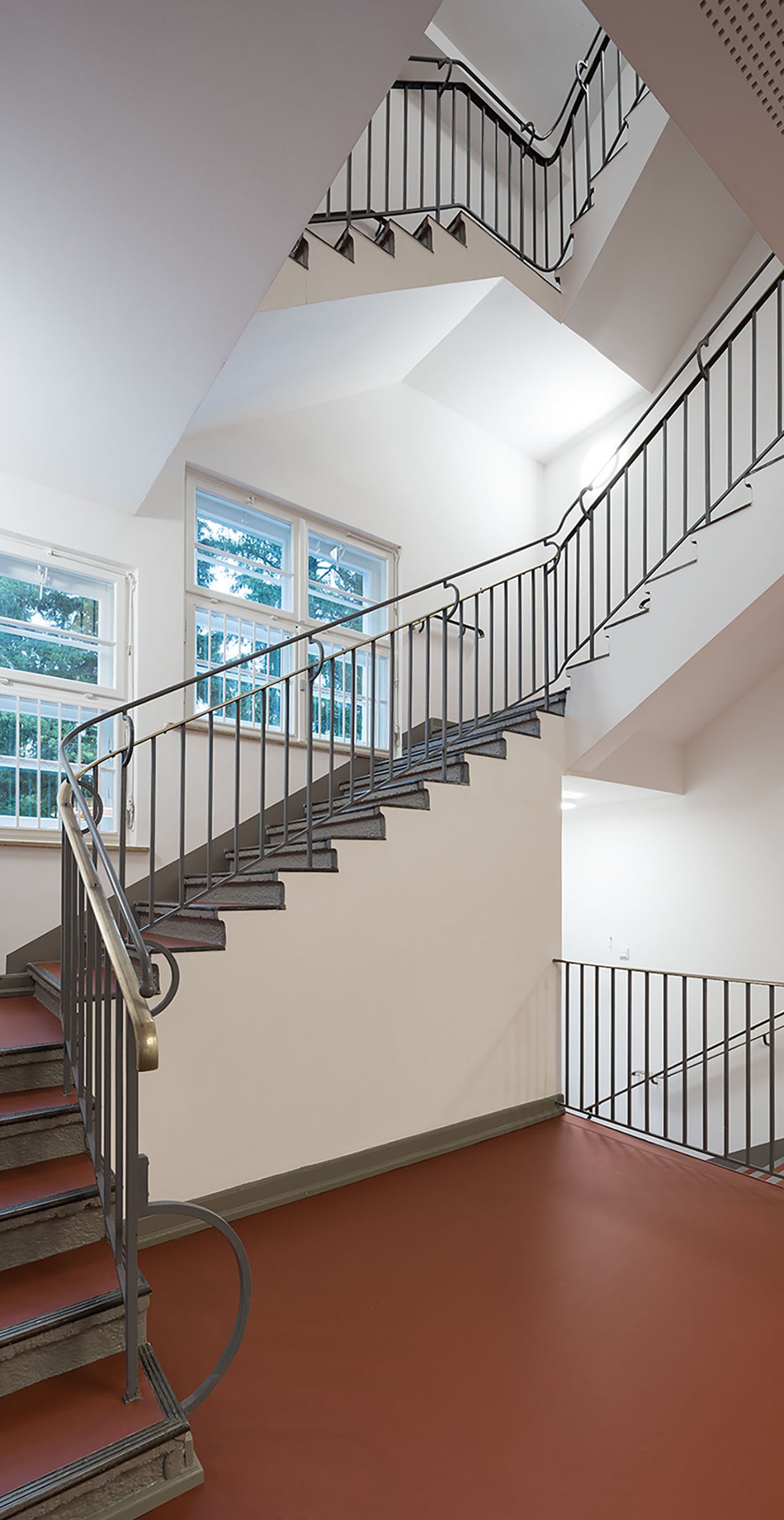 Das ehemalige Schulgebäude aus den 1920er Jahren steht unter Denkmalschutz. Neben der Instandsetzung der Außenhaut wurden im Inneren räumliche Umnutzungen (Verlegung der Küche) und umfangreiche Sanierungs-, Brandschutz- und Akustikmaßnahmen sowie eine Erneuerung der Haustechnik- und Elektroanlagen durchgeführt. Vor Ausführungsbeginn wurde eine umfangreiche Bestandsaufnahme des historischen Gebäudes vorgenommen, die Grundlage für das Sanierungskonzept des gesamten Gebäudes bildete. Die originalen Kastenfenster und Türen aus Holz einschließlich ihrer Beschläge wurden überarbeitet und konnten erhalten bleiben. In Absprache mit der Denkmalschutzbehörde wurde die originale Farbgebung rekonstruiert und ein Farbkonzept entwickelt.