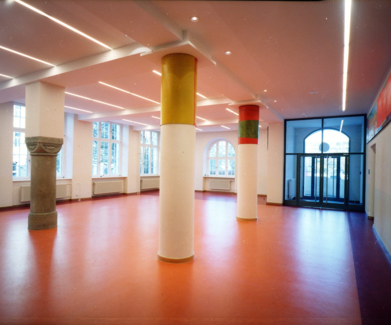 Die Innenräume wurden an neue technische und pädagogische Anforderungen angepasst und brandschutztechnisch ertüchtigt sowie die Fasasadengliederung rekonstruiert.