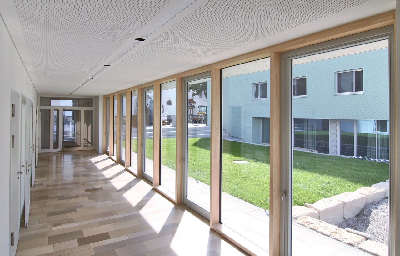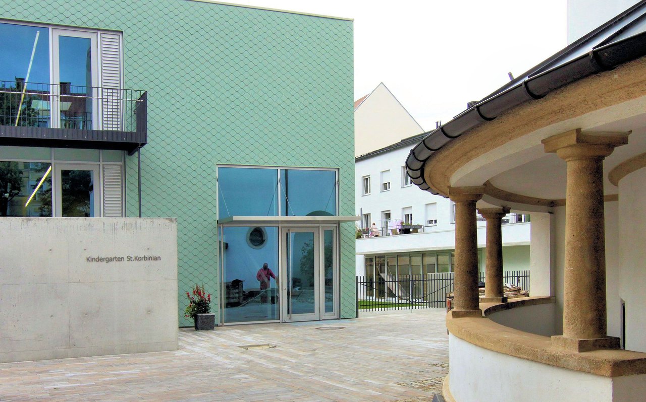 Der bestehende Pfarrsaal wurde an der dem Kindergarten zugewandten Längsseite um einen eingeschoßigen Neubau erweitert. Dieser Neubau dient als Foyer und Eingangsbereich zum Pfarrsaal der Gemeinde St. Korbinian und öffnet sich raumhoch verglast zum begrünten Bereich zwischen Kindergarten und Pfarrsaalgebäude.