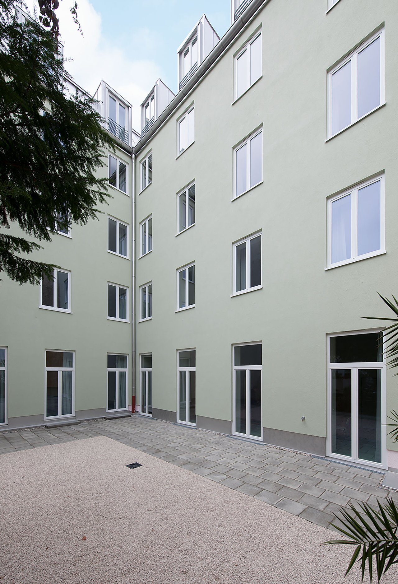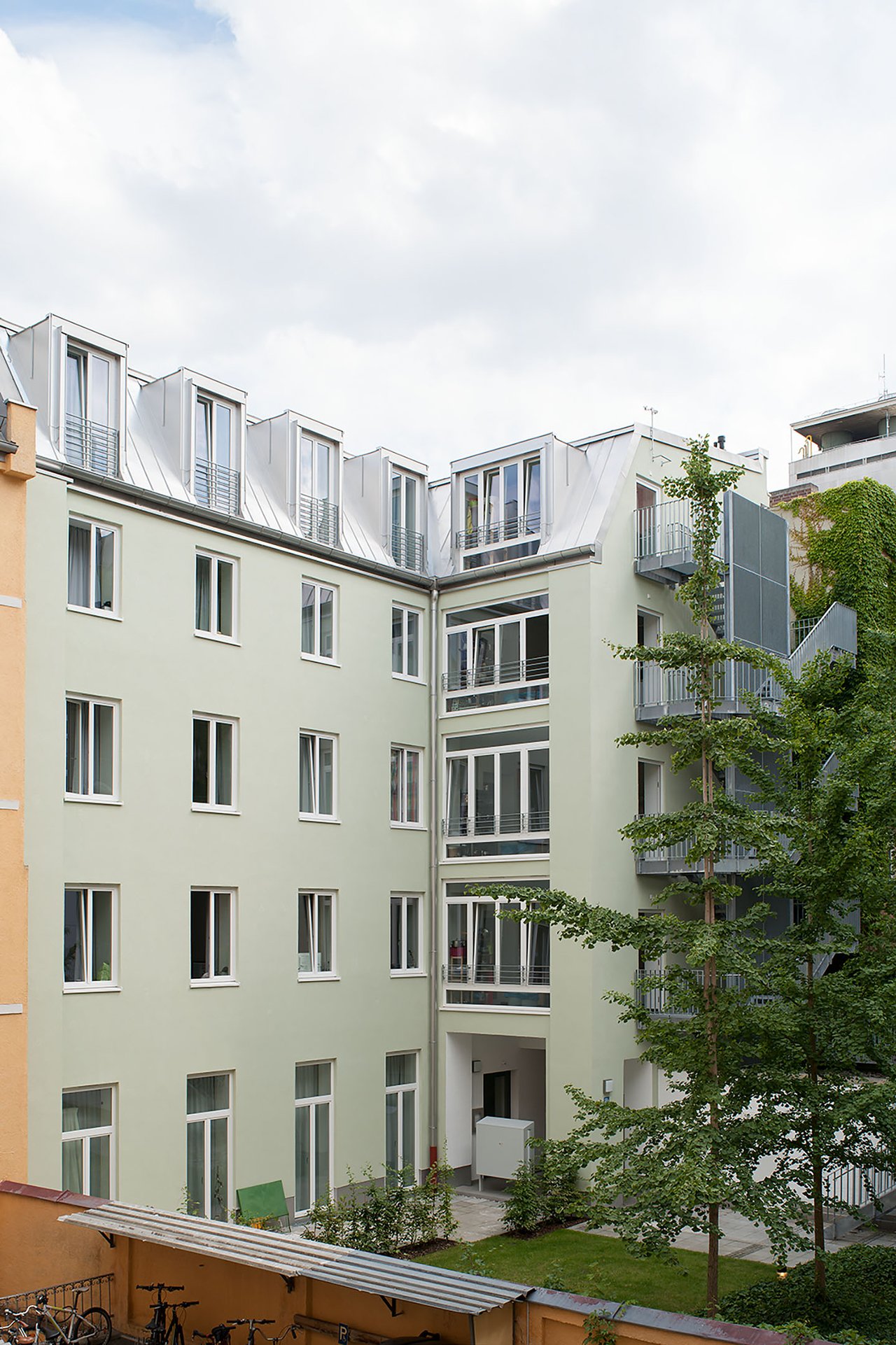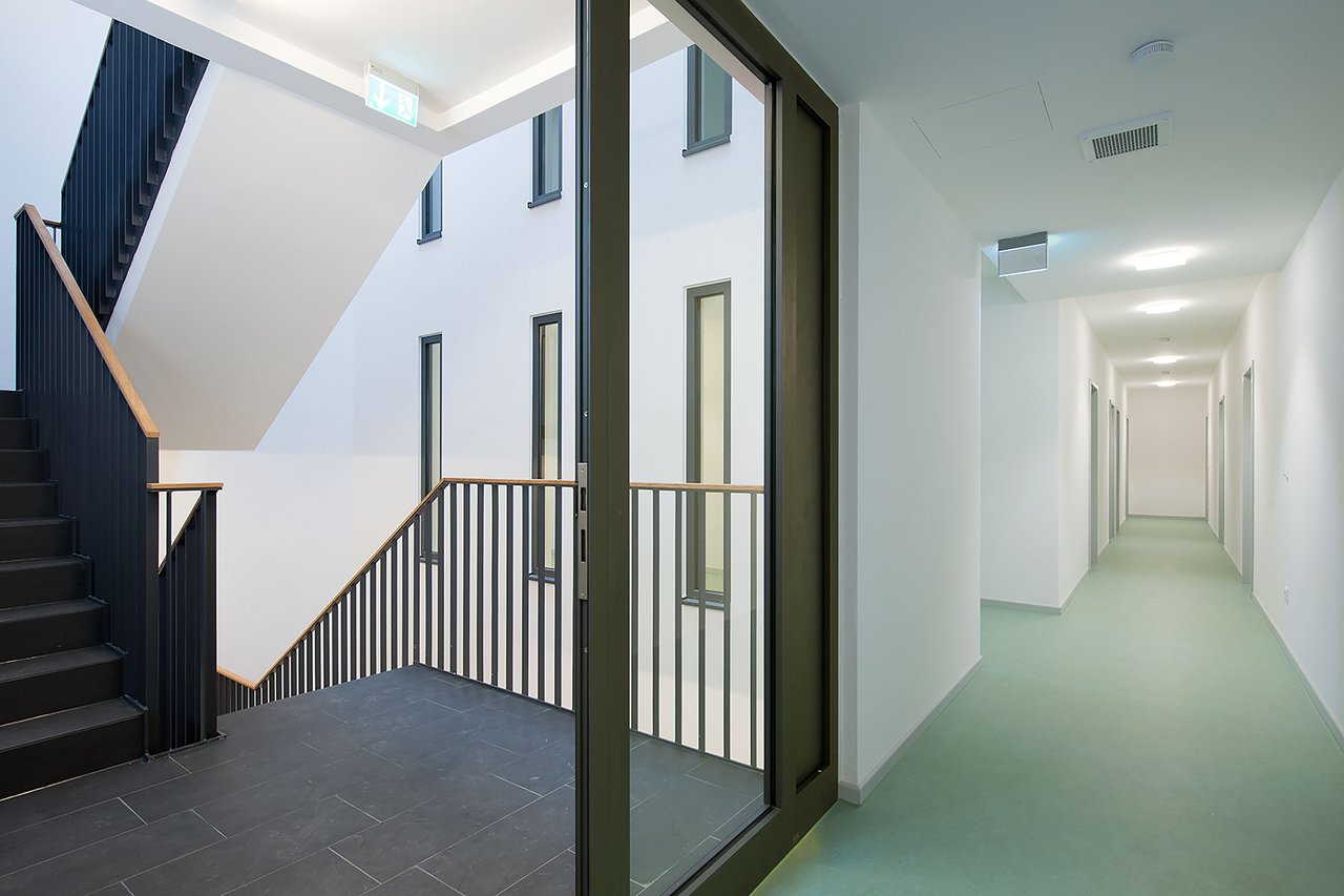 Im Bereich des alten Treppenhauses wurden nach Entkernung und Einzug neuer Decken die Gemeinschaftsküchen eingerichtet. Das neue Treppenhaus mit Luftraum liegt in einem Gebäudeteil, der wegen der Nachbarbebauung für Aufenthaltsräume nicht genutzt werden kann. Eine besondere Herausforderung stellte die Baustellenlogistik durch die Rückgebäudesituation dar.