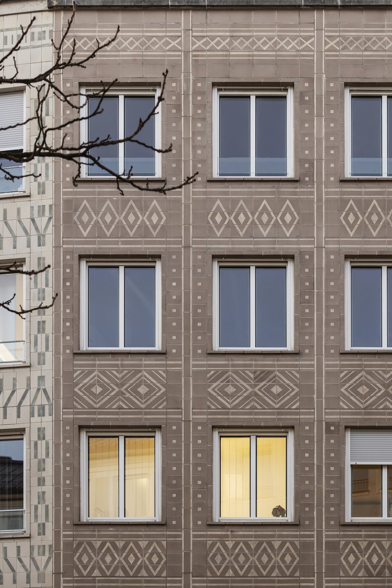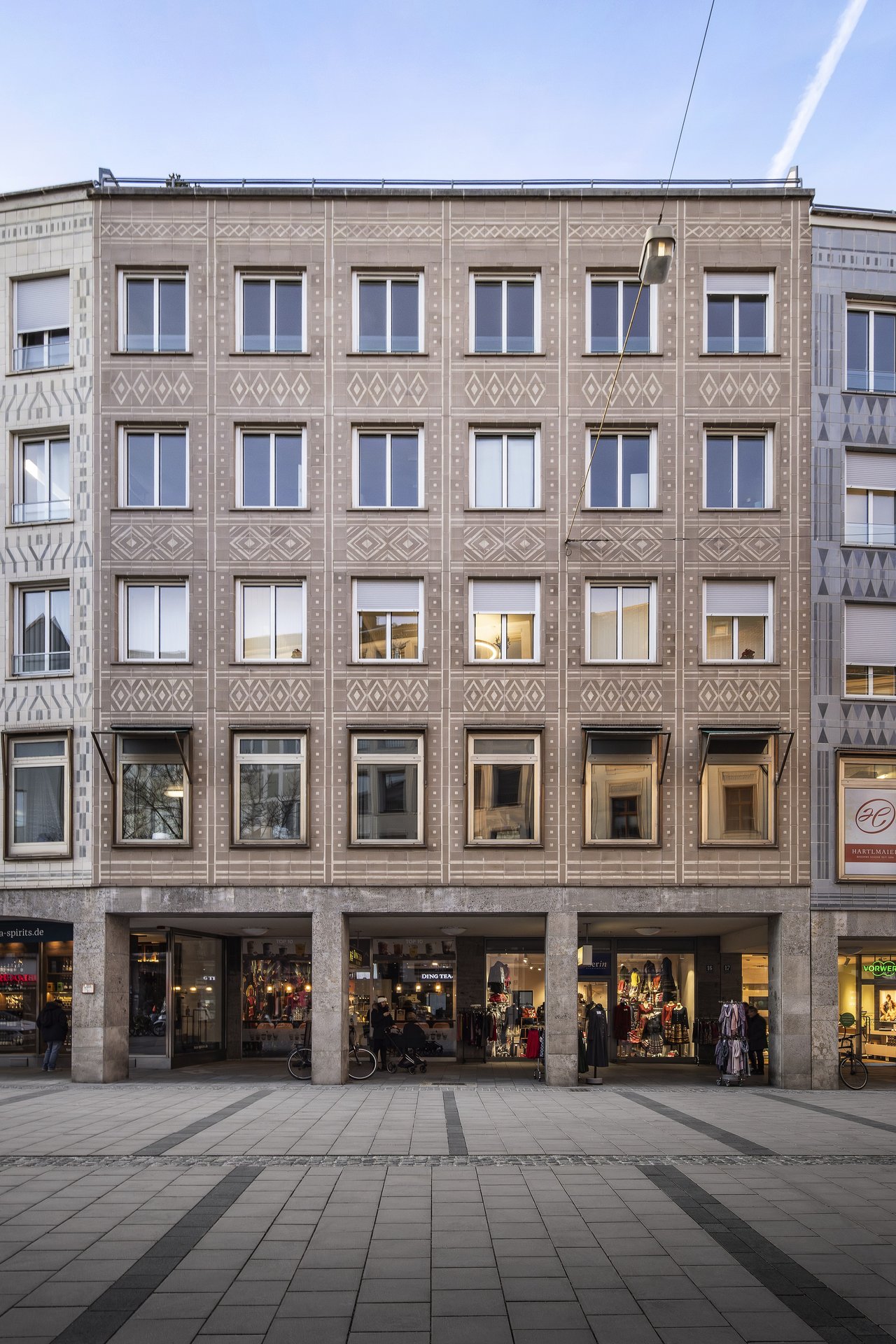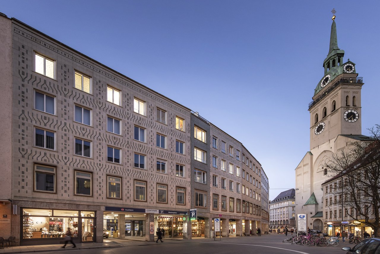 Bei der unter Ensembleschutz stehenden 7-teiligen Häuserzeile aus den späten 50er-Jahren in der Münchner Innenstadt mit außergewöhnlicher Fliesenfassade mussten bei laufendem Betrieb verschiedene Instandsetzungs-, energetische Ertüchtigungs- und Umbaumaßnahmen durchgeführt werden. Die Maßnahmen umfassten die Erneuerung der Fenster straßenseitig, anbringen einer Innendämmung, die Instandsetzung von Fassade, Dach und Dachterrassen, die Erneuerung der vorhandenen Kälteanlage, Brandschutzmaßnahmen und den Umbau einer Gewerbeeinheit in eine Kanzlei und eine Ladeneinheit.