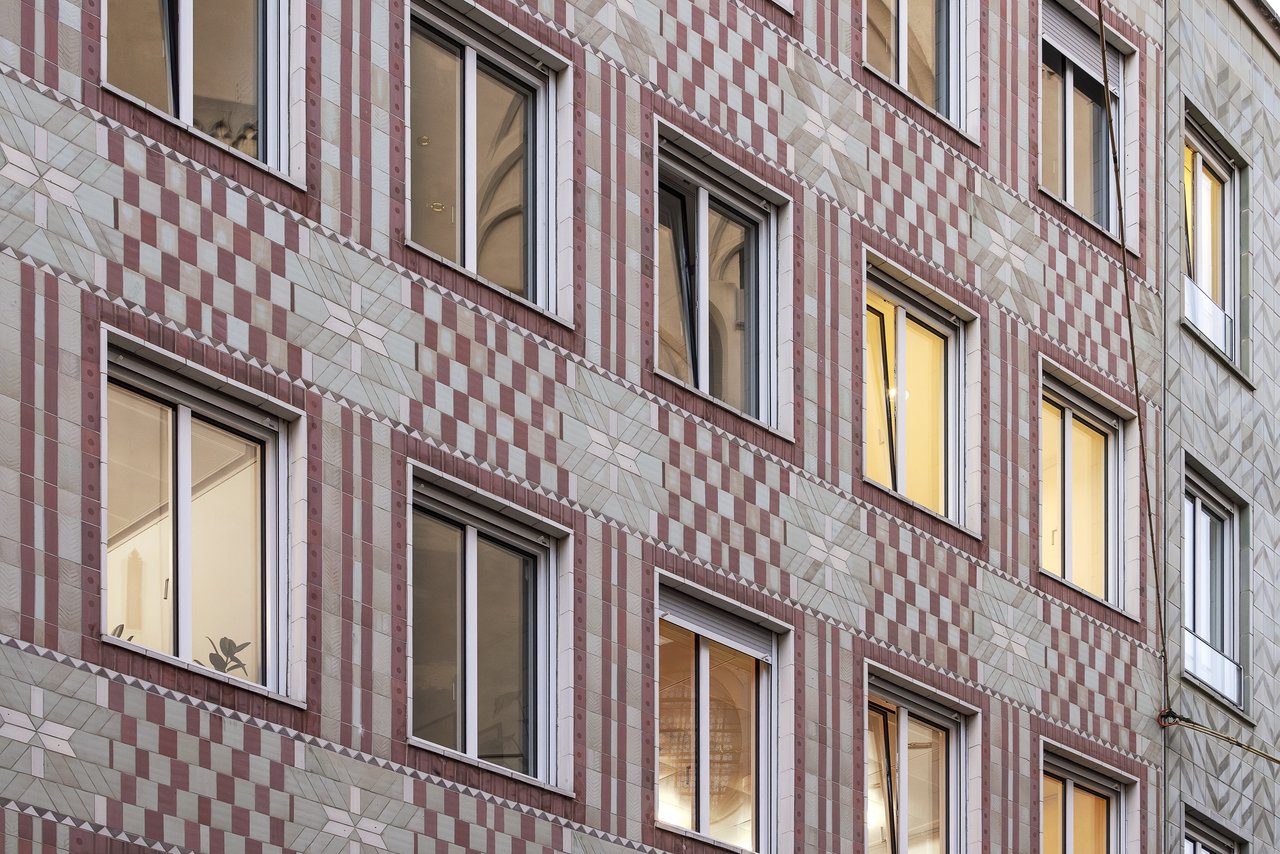 Eine Herausforderung stellte der Austausch der Fenster- und Rollladenanlagen bei der unter Ensembleschutz stehenden Fliesenfassade und bei laufendem Betrieb dar. Durch Verwendung eines Einschubfenstersystems konnten Schäden an der historischen Fliesenfassade vermieden und die Beeinträchtigung der Mieteinheiten mit teils starkem Publikumsverkehr auf ein Minimum beschränkt werden. Da die Fassade außen nicht verändert werden durfte, kam eine Mineralische Innendämmung zum Einsatz.